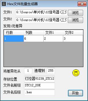 选择两个Hex文件,工具自动发现两文件的差异,输入起始递增数值、存放位置等信息,点击“开始”按钮。